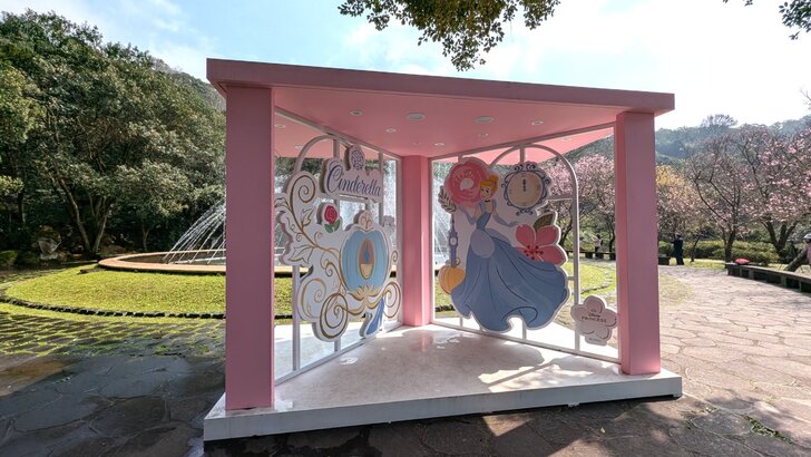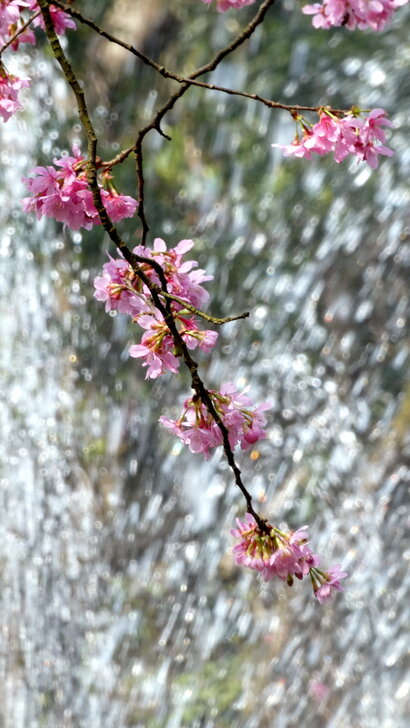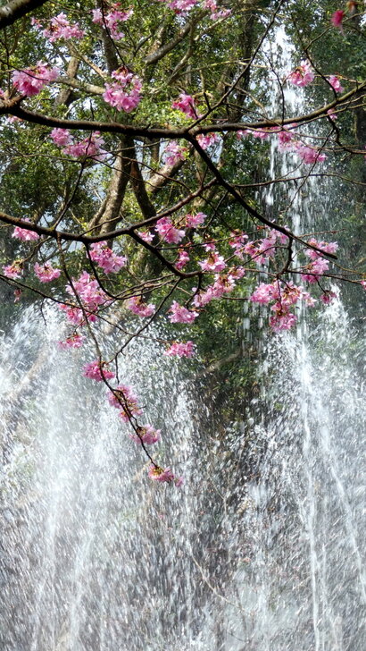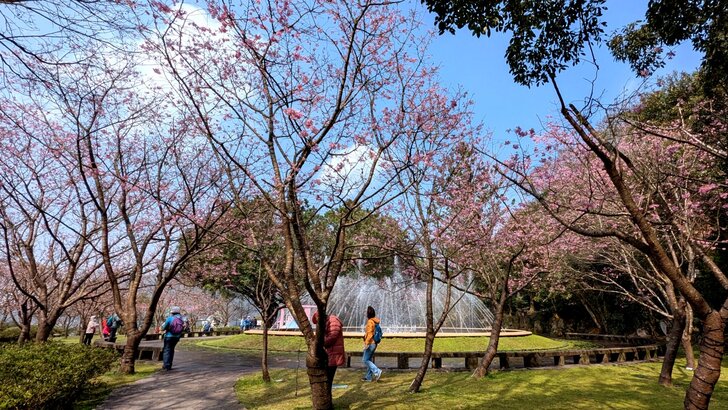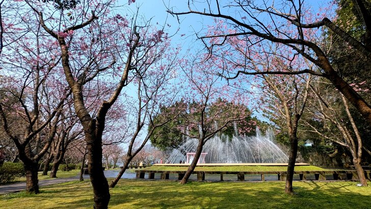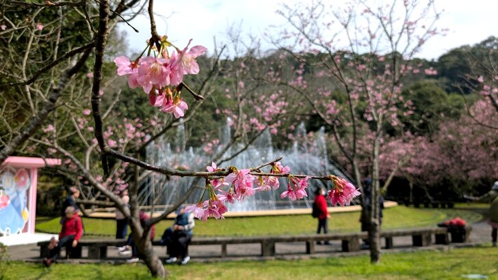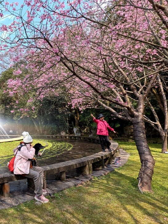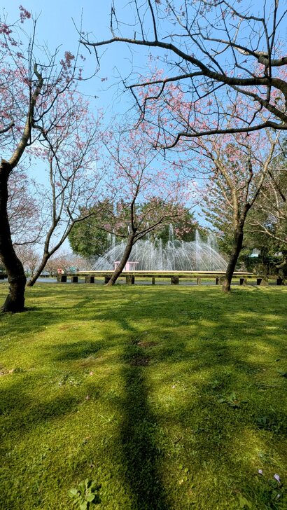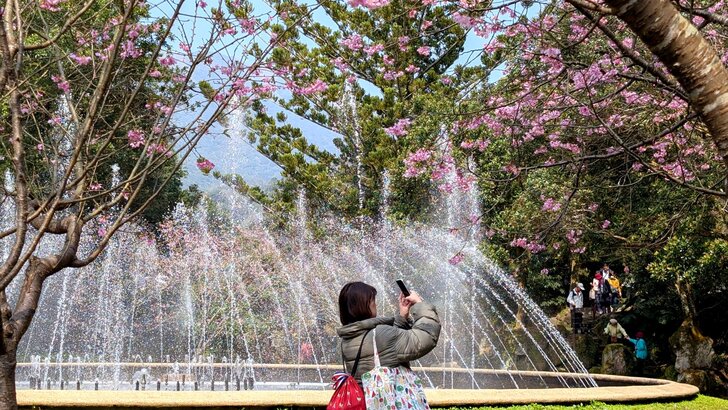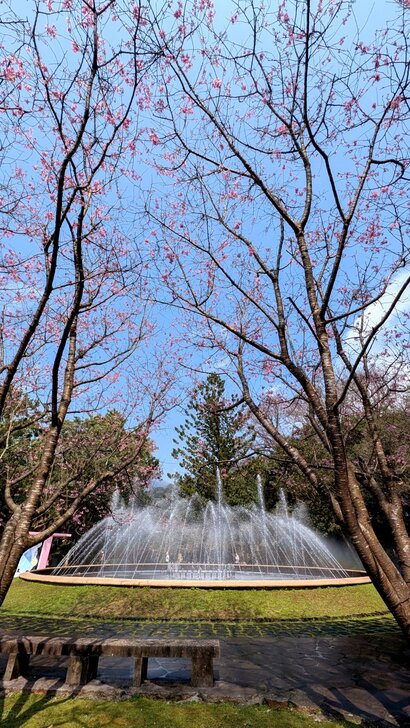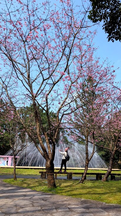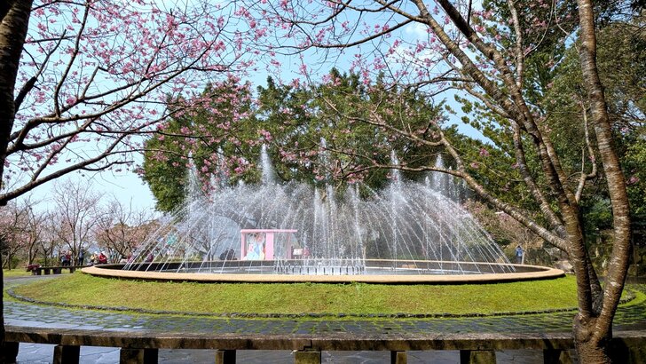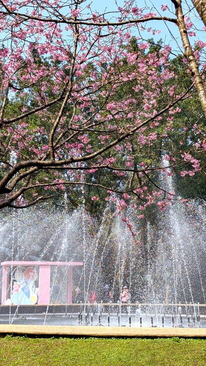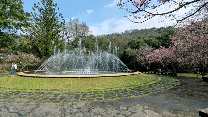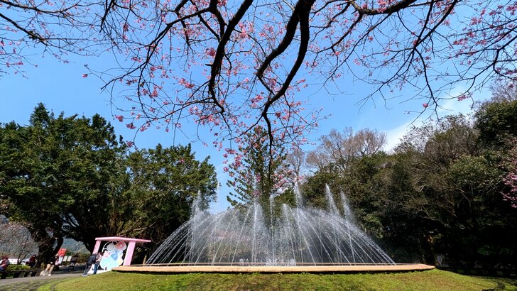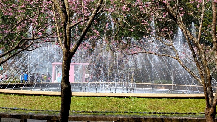 到陽明公園服務中心站後,才往走上幾步,就見噴水池旁的昭和櫻開,水~↑↓