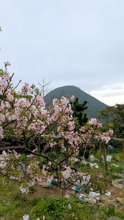 到了東昇步道入口處.大宅院及其附近的山櫻、八重櫻都已成過去,只留得一株昭和櫻,而左邊田園裡不少昭和櫻苗開花,只是不成氣候.↓