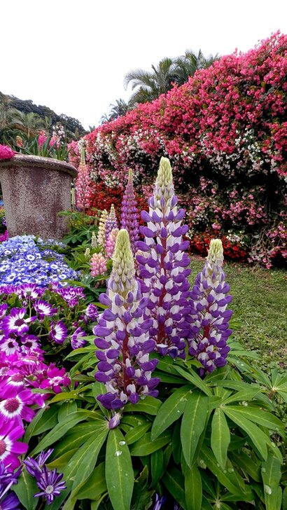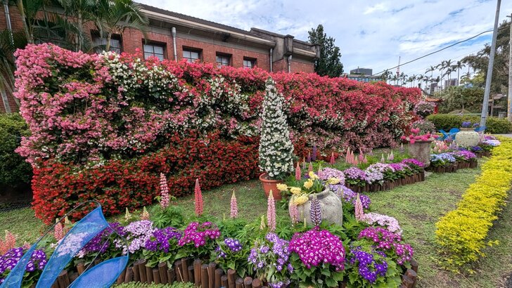 接著往新蘭亭去看春節花卉展(展期2/14~4/6),路邊花牆美麗,牆下有著美麗花草及彩色魯冰花(羽扇豆).↓