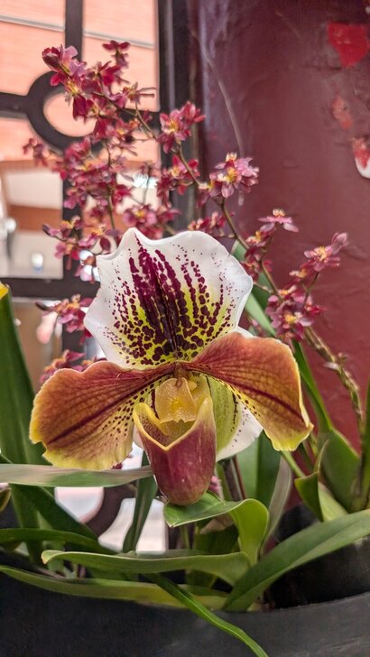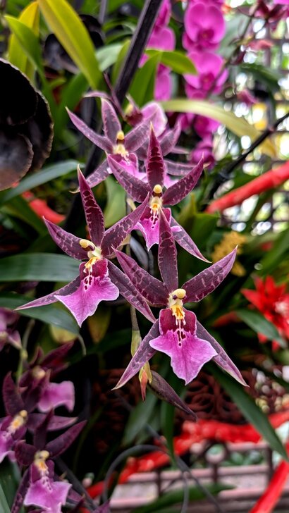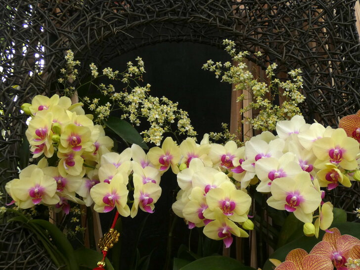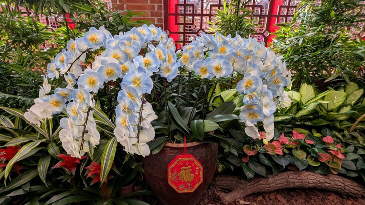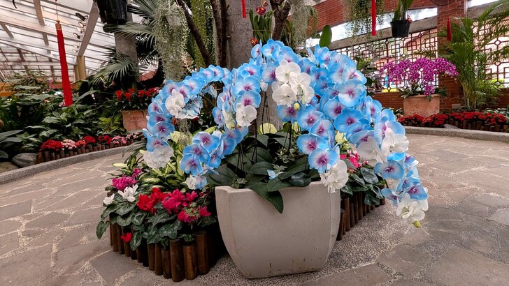 春節花卉展以「蝴蝶蘭」為主角,搭配文心蘭、拖鞋蘭、嘉德麗雅蘭及年節應景植栽,打造夢幻的蘭花秘境.↓