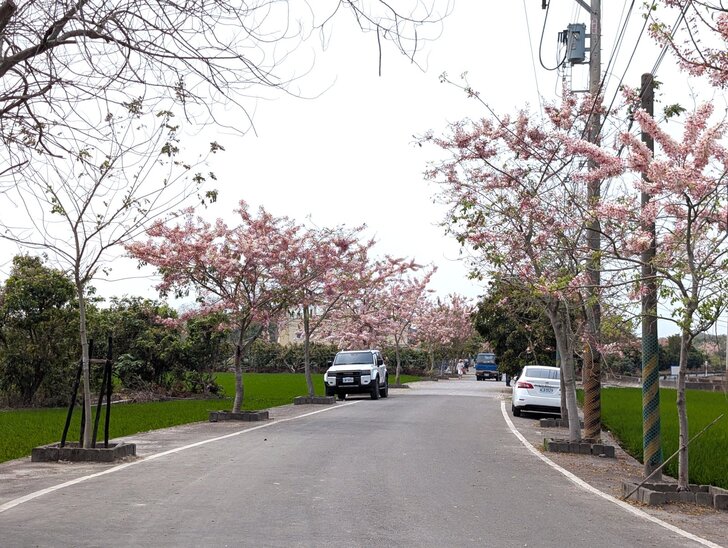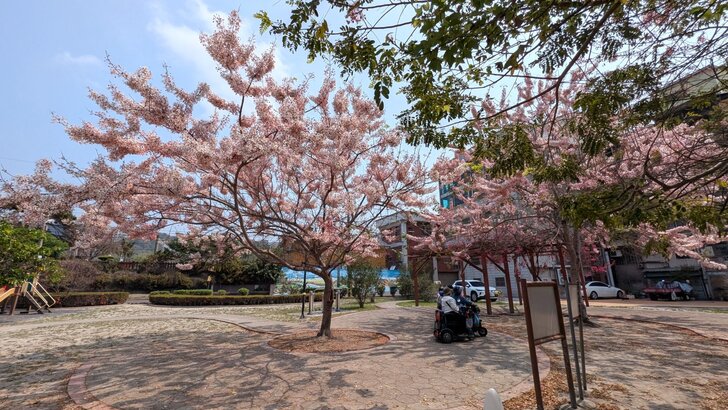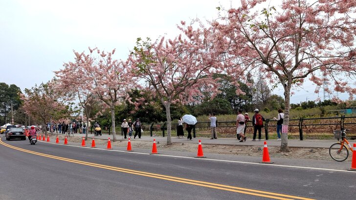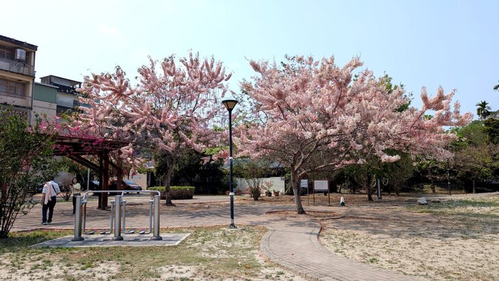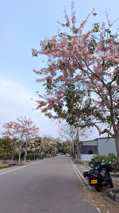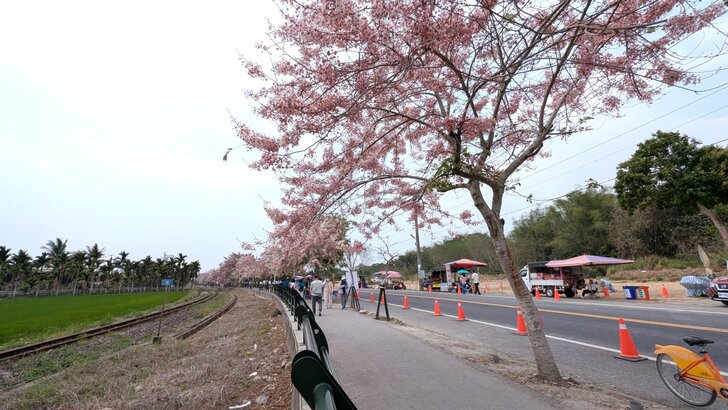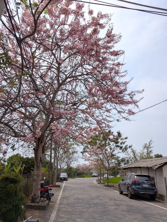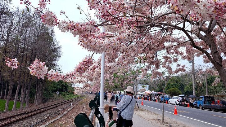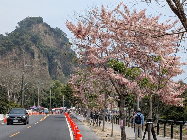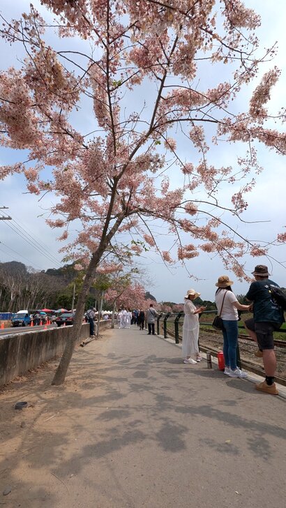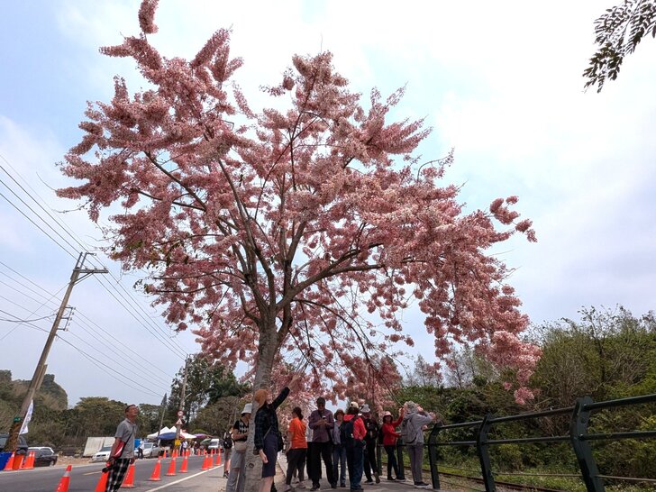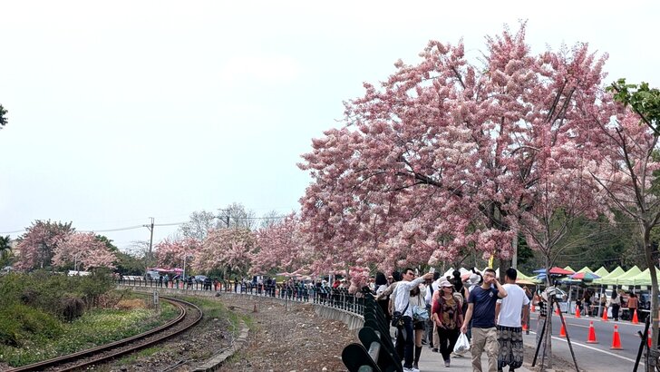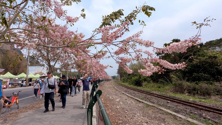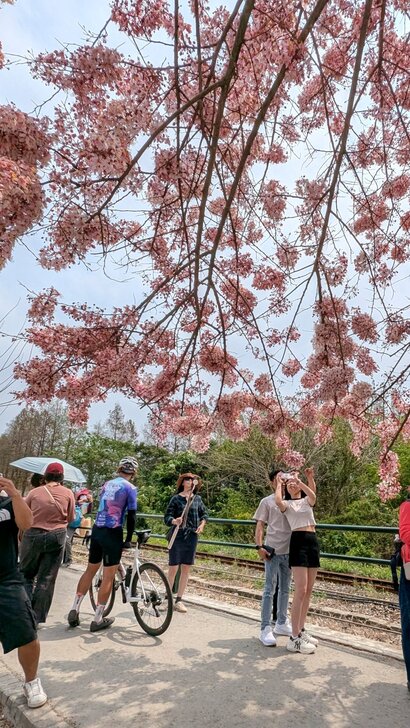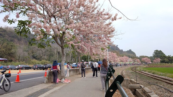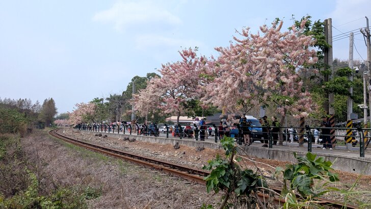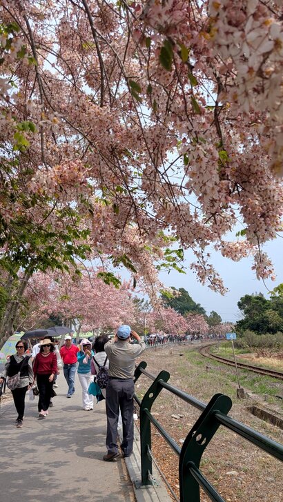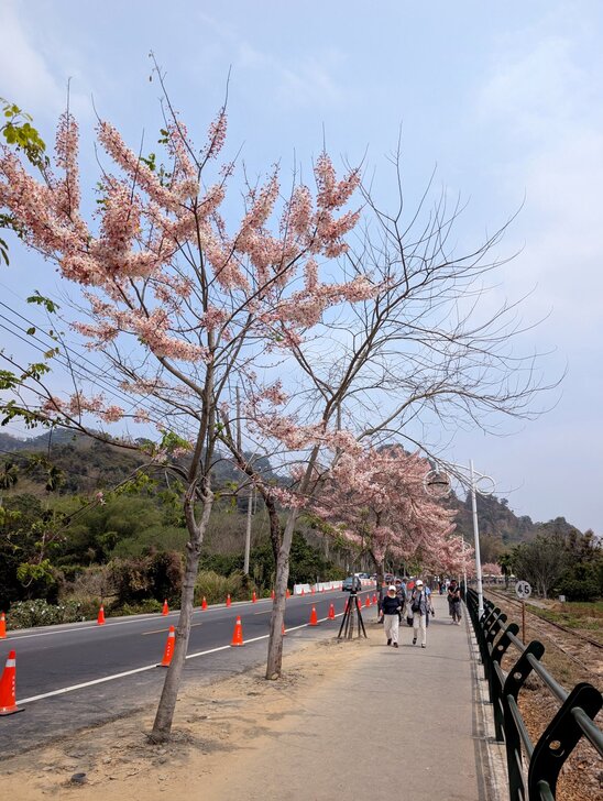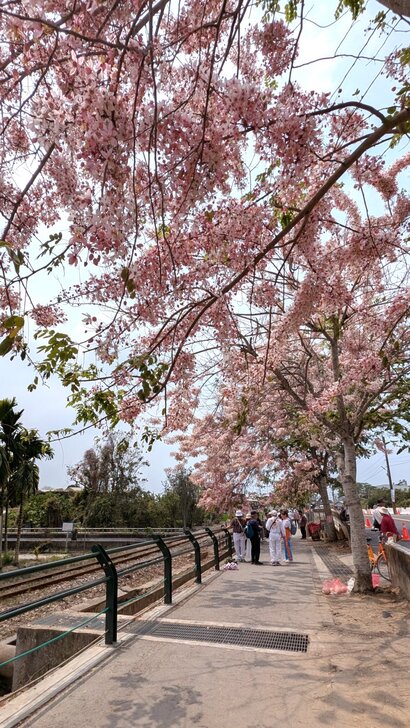 鐵道花旗木約有三百多公尺長,每到春日花開.繁花似錦,如粉紅煙雨般的,加以鐵道相伴,美不勝收.↓