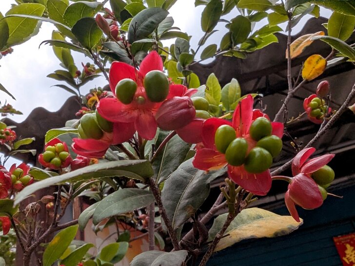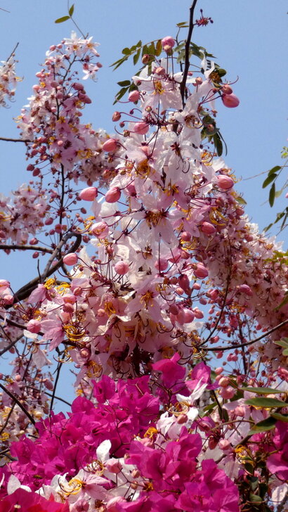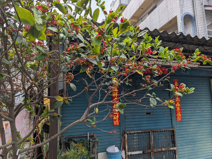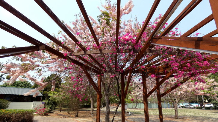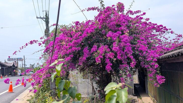 這花棚造型不錯,有九重葛開著花,可以和花旗木合影.↑