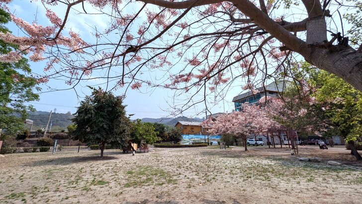 來到之前看到的那個櫻花林,置身其中,似乎不如對面看過來好看!↑