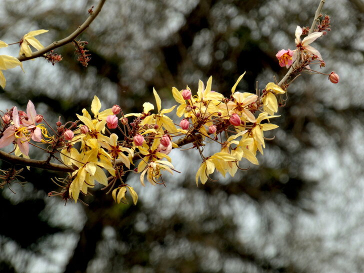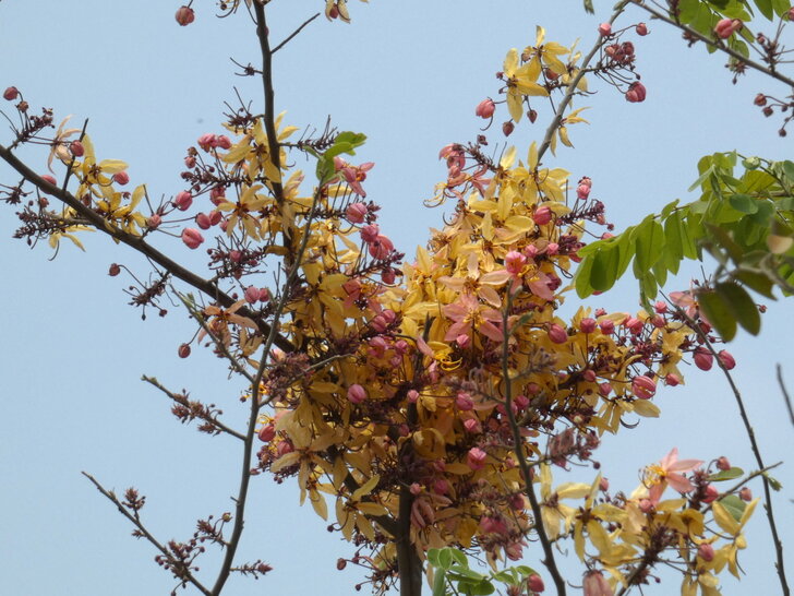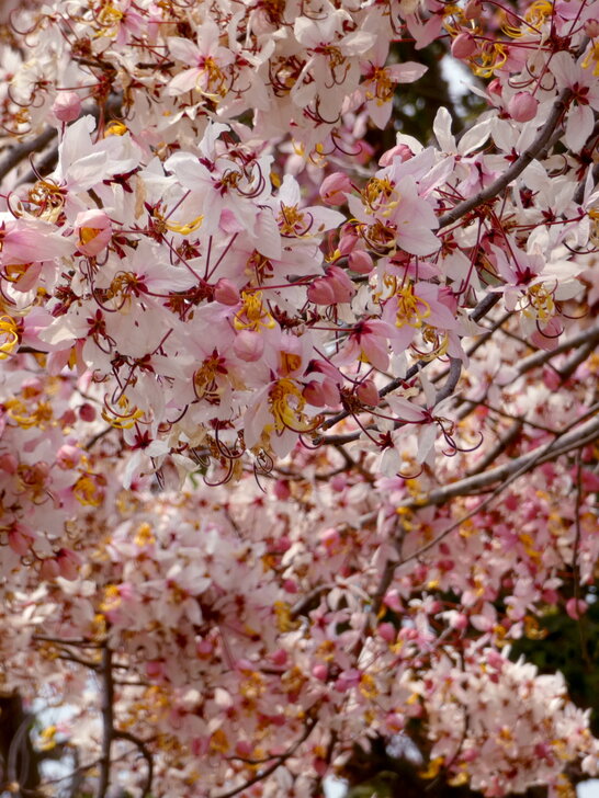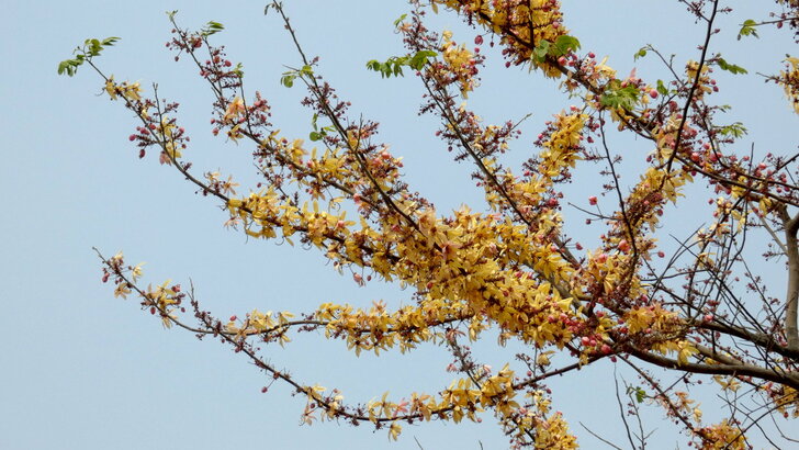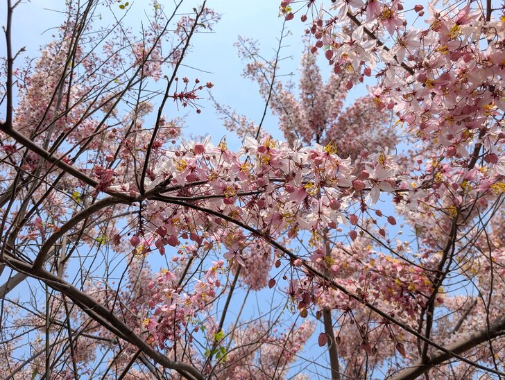 快到花道尾端時,瞥見對面停車場邊幾株黃花,好像也是花旗木耶!↓
