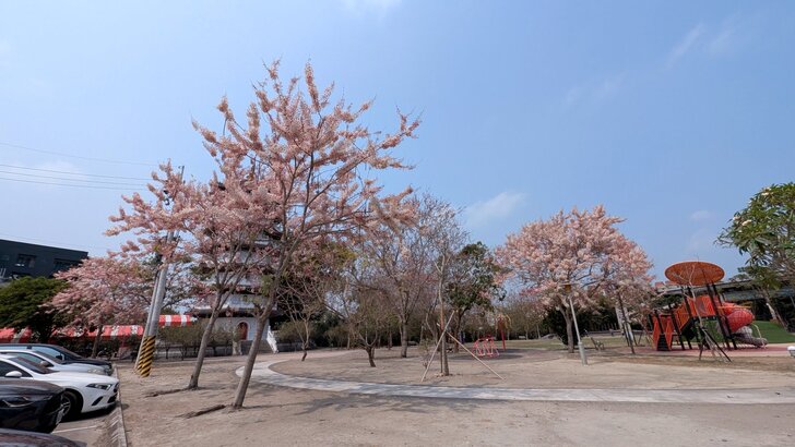 出了小公園,回到車站,然後沿鐵路邊的路往南騎去,八百米後就到了水之心運動公園,環著公園有幾株花旗木.↓