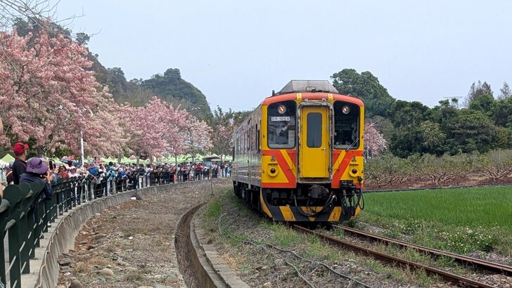 12點了,接著來拍火車經過花道美景,先來錄影12:06源泉站開出的列車,但不知何故竟失敗了,只好等待12:16濁水開出的列車;我不想在最佳拍攝點(下面照片的左方)跟人擠,就到後面沒人的角落處等待,隔一陣子二個大媽一面碎念別人如何沒水準的搶位置,一面就跑到我的鏡頭前,真讓我無語,正在想我真的要無語嗎?二個大媽大概看位置不是很好,就又走了,而我總算能安靜地拍個鏡頭(不再錄影,改用拍攝).↓