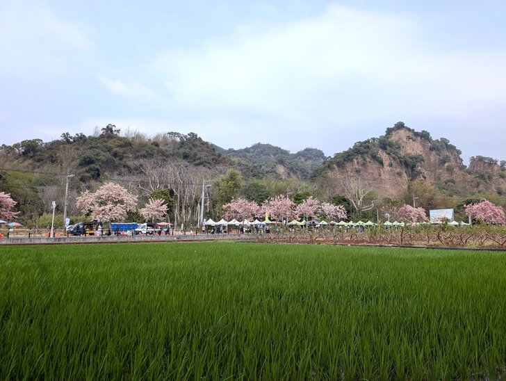 可惜花剛初開不茂盛,且這時天氣忽然轉陰颳起風來,泥土的臨時停車場飛沙走石,讓人睜不開眼,只好拍幾張後快閃.