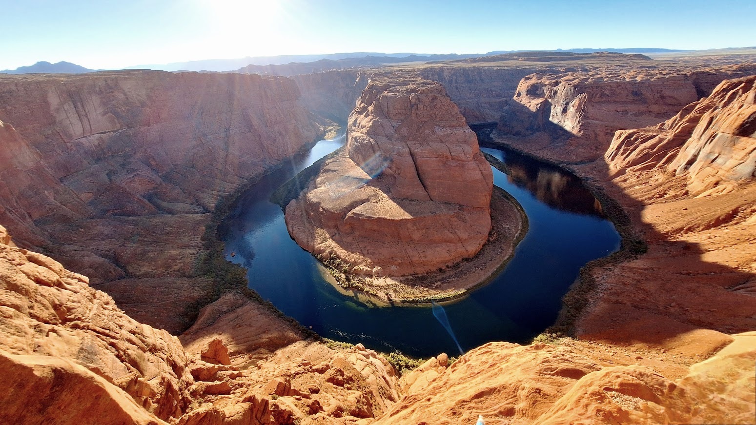 翡翠與紅岩的交織: 科羅拉多河像一條鑲嵌著翡翠的緞帶,優雅而狂野地繞著中心那座巨大的紅褐色孤峰旋轉了 270 度。河水的翠綠與岩石的火紅,在陽光下碰撞出強烈到近乎不真實的飽和度。