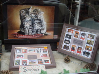 存在著許多藝術家的巴黎蒙馬特山丘,我無意間被一幅栩栩如生的貓咪油畫給吸住了腳步,太吸引人的貓咪油畫!!沒有第二個想法,直接推開藝廊的玻璃門,想跟這位創作者聊聊。不知我哪來的勇氣,在有意地闖入後,藝廊中有一位滿頭白髮的爺爺正在專心地畫著天空油彩;他,我稱之貓爺爺,在店裡擺設的畫有一半的牆是貓咪,而我有興趣的是12張一套的貓咪郵票,原來,全是他的貓咪創作,他吞吞地試圖跟我解釋,他原創作的貓咪畫售價是1000歐元,而以印刷翻版的賣100歐元,他知道我喜歡他手繪製的貓咪郵票,還特別建議我說要就買 “24張”才是整套貓咪郵票,是他分開為兩套分別販售的,本因經費拮据只想選一套作為紀念就好,但,貓爺爺繼續解釋說道:「郵票的齒踞狀是貓奶奶手持剪刀,一刀一刀剪出來的!」,頓時,腦中出現的是一位坐在昏暗燈光下老奶奶的背影,正全神貫注的把大張紙悉心地剪成郵票般尺寸的貓咪郵票,那敬佩的價值感油然而生,再怎麼樣貴,我都願意買上一套,因為我必須把貓奶奶的期許及自己的感動也買下來,於是,我得到了完整地24張貓咪郵票圖,也擁有了貓咪爺爺與奶奶的回憶。貓爺爺應我的要求,在他原創的貓咪油畫前合影,可惜我太緊張,沒照清楚,不過很開心遇上貓爺爺,帶給很愛貓的自己在有形及無形非常有紀念意義價值的旅品。