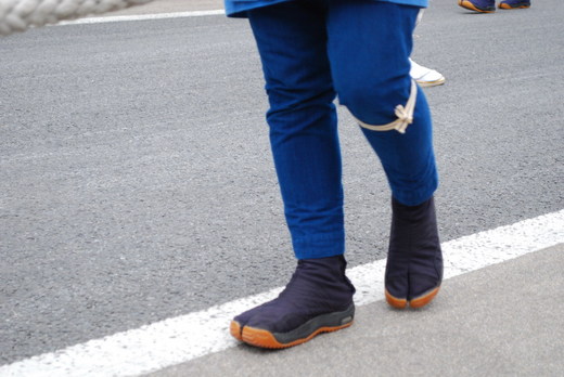忍者鞋,我一直好奇盯著這雙鞋,造型看起來很酷樣,但底部是什麼一直搞不清楚,後來終於看到一位老伯的黑鞋翻了起來,原來是膠底;據說,使用膠底鞋磨擦力、抓地力都極好,很適合做勞力時穿著。這雙跟火影忍者的忍者鞋不同的是,它是用兩指方式包覆腳指頭,而不露出腳趾的黑色膠鞋,有點類似人字拖的兩趾鞋樣「忍者」的造型,也稱為兩趾鞋。