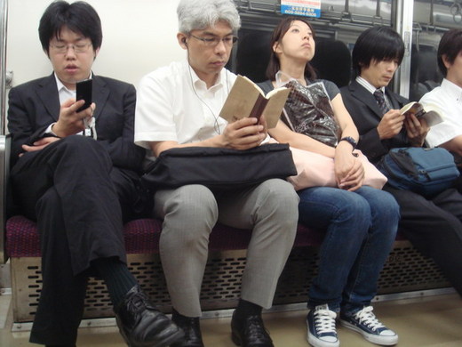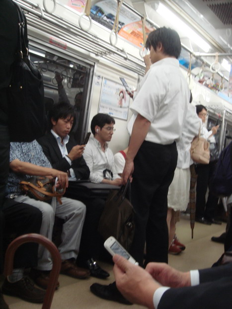 首先跟台北捷運不一樣的是:電車手機一律轉震動而且不能講手機,但是,這也不會影響對外通訊,原因連帶老花眼鏡的阿吉桑都會用簡訊通知朋友們,他還有幾分鐘會到達見面地點,幾乎在電車放眼望去,只有人生四態:打盹、看書、發呆、打手機,人手至少1機,他們手指靈活的程度,實在不得不懷疑,他們手機功能應該比我們好上幾倍,後來發現除了傳簡訊之外,他們都在手機上上網或玩遊戲殺時間。