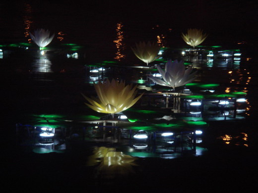 晚上7點,沒有預期的搭船人潮,花了30分鐘在粼粼波光及汽船的引擎聲下結束大佳園區大佳-大佳往返的藍色公路,晚間遊船的重點,據說是睡蓮光雕、水管橋光雕、大直橋的