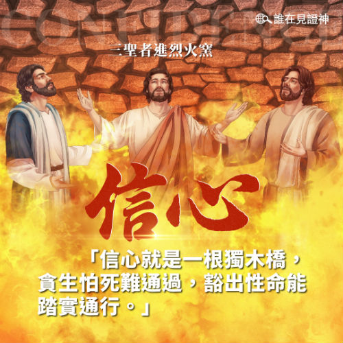 相信大家都看過,三聖者進烈火窯的故事,看到他們對神真實的信心,寧可死也不跪拜偶像,最終神向他們顯現,使他們能在烈火的窯中,仍安然無恙渡過難關。