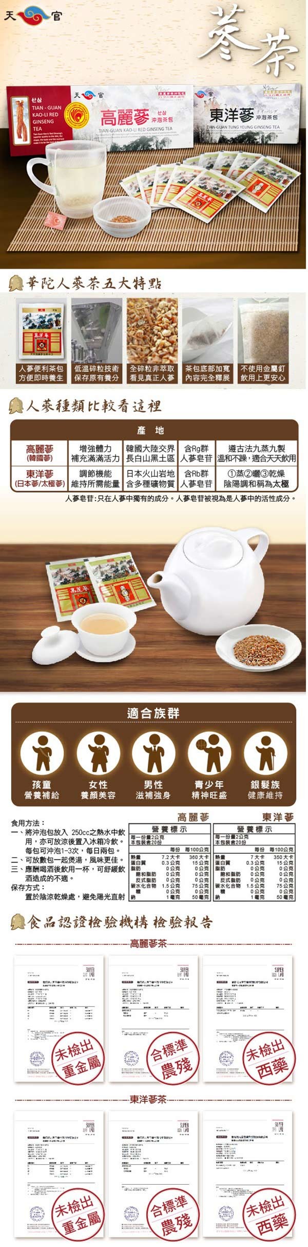 1 主商品 1 天官高麗蔘茶沖泡包 每包2公克 5 20入 盒 x2 市價1580元 2 天官東洋蔘茶沖泡包 每包2公克 5 20入 盒 x2 市價1580元 贈品 天官高麗蔘茶沖泡包 每包2公克
