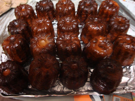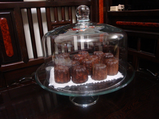 自從認識『可麗露』後,廢寢忘食的連做了好幾天,直到昨天深夜11:35分終於達成我滿意的色澤與脆度,這是第六批〈20粒〉之前的100粒有太焦的、太軟的,也都一粒不剩的吃光光了。今天特地去買了一個玻璃罩來擺放這焦黑發亮的小東西,頓時升級身價非凡的。