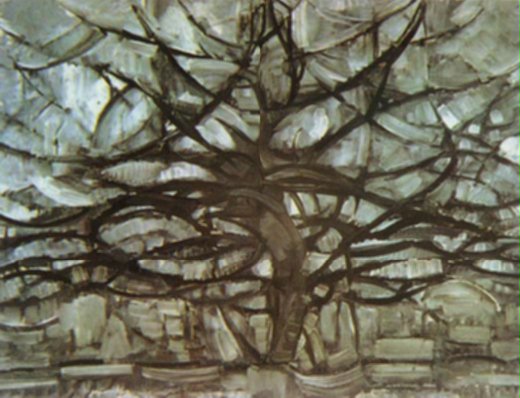 整棵枯樹中,樹幹是特別淡的,幾乎要淡出這畫,好似黑暗的實體將被抽離出人世。如果如您所說,這畫是蒙德里安前後期畫作的轉折,我想,後期的蒙氏已被救贖到一個純淨的光影中,只有光,只有色塊,明亮而幾何理性的活在那抽象的世界裡吧。