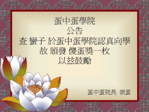 上圖──由於本人於蛋中蛋學院修業,在校期間勤奮好學,糾纏無我老師更是不遺餘力。畢業考成績揭曉。我以優異的零鴨蛋成績,發揮蛋中蛋道統精神淋漓盡致,無人可出其右,所以獲得此殊榮!