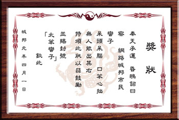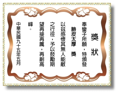 下圖──本人出名臉皮厚,而且纏人功夫了得。我的經紀人「哈魯」,在我多次毛遂自薦而不堪其擾的情況下,硬擠出這麼一張閃著金光的獎狀給我。我能夠獲得這張獎狀,可真所謂實至名歸!