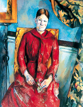 至少塞尚是這麼努力嚐試的。他在意的不僅有妻子的容顏,還有裹在這紅衣裡頭小小的情懷。猜想他是比較在意後者的世界。你瞧!他視線雖刻意停駐在她臉上,卻不時偷偷往下溜去,又偷偷返回。或許正在比較兩者之間的異同吧!這確實是個謎,耐人尋味....