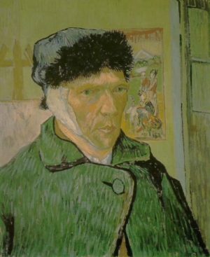 老師正在講精神分裂的梵谷,光光梵谷和高更吵架憤而割耳朵的八卦就講了將近二十分鐘。而梵谷那張頭部纏著繃帶的自畫像成了故事的援例,而不是欣賞的重點。