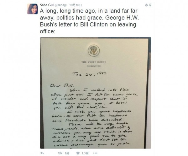 美國網友貼出老布希當年寫給柯林頓的信,暗諷川普沒風度。(圖擷取自網路)