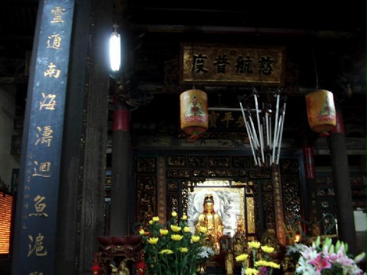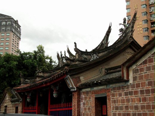 淡水龍山寺,主祀觀音佛祖,為泉州府三邑人之守護神,創建於清乾隆年間。今廟則為咸豐三年(西元一八五三年)重建,咸豐八年(西元一八五五年)完成。民國七十四年又修建,增加一座拜亭。清光緒十二年(西元一八八六年),中法戰爭結束後,巡撫劉銘傳曾奏請賜匾,御書「慈航普渡」懸於寺中。此寺反映清咸豐年間之廟宇建築風格,尤其瓜筒及石雕、龍柱之手法,甚具研究價值。 (北縣古蹟誌)