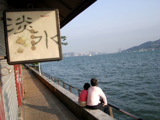 小舖前的淡水二字,與遊人、河岸相輝映。