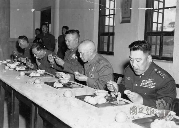 照片裡,老蔣總統與眾將正進食尋常餐點,不知道是早餐或午餐會,不鏽鋼自助餐盤,食物簡單,兩樣小菜,一碗湯品,幾顆小饅頭,右上方放著一小顆橘子。蔣左手邊的空軍將領王叔銘吃著正香,而蔣則慢條斯理,左手拿著一顆饅頭,右手以筷箸夾取湯裡的佐料,不急不徐,沉着冷靜,幾分的若有所思,此正是一位戰時領導人應有的特質吧? 當年兩岸持續對峙,韓戰如火如荼,越戰引發區域緊張,氣氛肅殺,人心浮動,金門、馬祖隨時處於備戰狀態。