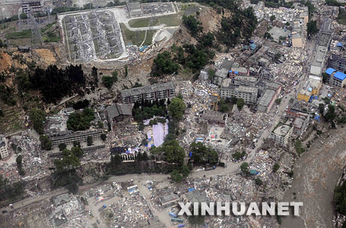 空中看震後的汶川縣映秀鎮災情.(圖片引自新華網報導)WWW.NEWS.CN