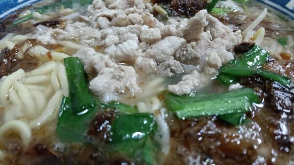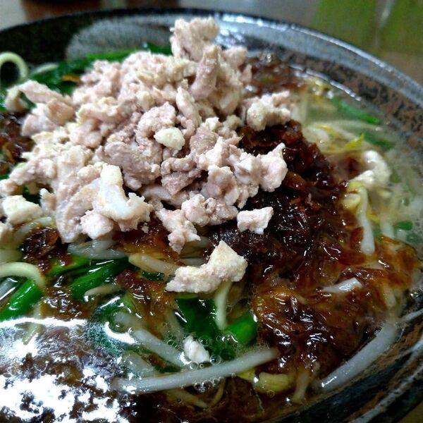 我找到後頭大圓桌的空位,與一位盛裝打扮的女士併桌,見她面前是一大盤滷菜與豬頭肉、大碗粄條,我油然升起幾分敬意,是了,難得來「余家客家小吃」一趟,豈能不大快朵頤一番 ?一想到此,也不填單了,我直接向店大哥點了一大碗「肉絲韭菜油蔥湯麵」,向店大姐點了一碟豆干滷蛋海帶,別看這滷菜清簡,淡雅芳香的輕鹹感,入味而不死鹹,我的首選。