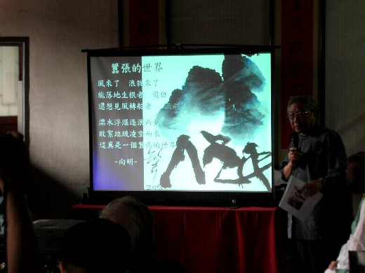 鄭愁予現場創作新詩一首。旁為李錫奇夫人,詩人古月。