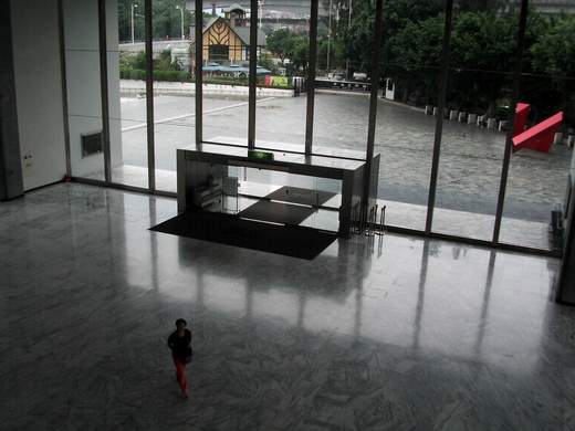 今日的目標是北美館, 經過舊園區, 穿越相隔兩頭的中山北地下行人道,這幢白色建築便映入眼簾。 遙想該館當年開幕情景, 堪稱台灣藝界盛況; 一愰眼二十幾個年頭過去, 建築物已然顯出它的年紀。 往日設在廣場前的李再鈐紅色金屬雕塑已成記憶,換成了幾座不甚入眼的黯淡物權充擺設, 以致甚難引起我的觀賞興趣, 繼續走入館裡。