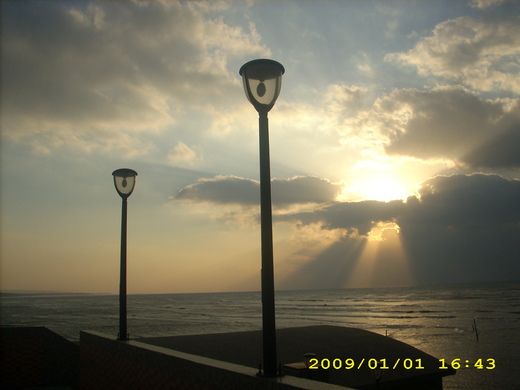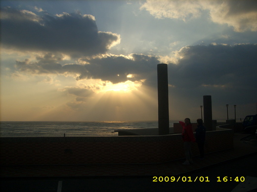 車行至傍海的永安,這地方是新屋鄉的邊陲海際, 早年據說十分荒涼蕭瑟, 經過多年演變, 此處已是桃園有名的休憩勝地, 過往遊客匆忙自四方奔流來去。 來到漁港已近黃昏, 見到夕陽殘暉直射海域煞是多情美麗, 我將陽春的小相機取出連忙捕捉了數張, 小朋友看到美景也是心中一喜, 搶著要親手拍攝下來, 所以相機易手, 由著小小的心靈恣情流露了。