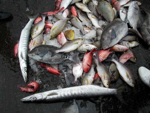 上圖,頭扁扁的怪魚是鬼頭刀,魚販直兜售,不曉得牠的滋味如何?