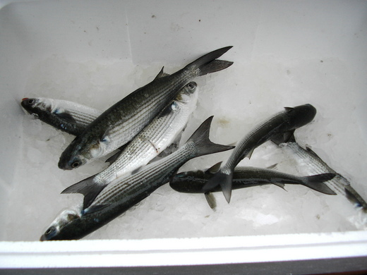 上圖/ 攤台上的鮮魚,以碎冰鎮住鮮味。 下圖 / 岸旁釣客捕獲的烏魚,約有25公分長,應屬青少級的大小,沒想到竟游來這麼大群。