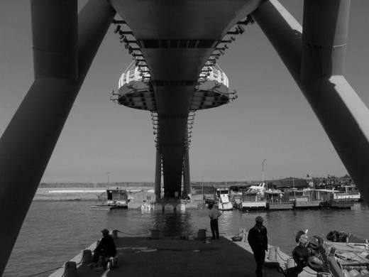 我散適行走, 隨興看看 ,聽聞其間 ,手中的相機往虹橋的底面與橋面尋去。 如此往返細察 ,竟發現一些難得的線條、近距與光影 。中間兩三釣客停格鏡底 ,各型船隻重重疊疊 ,竟是幾年來不曾注意的畫面 。於是乎開始將其收於記憶體 ,原先快門聲曾引起釣叟幾分注目 ,後來刻意低調放慢動作 ,整個橋底港區變得和諧許多 ,魚之樂、 光影之樂 ,在午後與船隻疊繞。