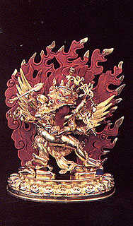 右手持骷髏寶杖表示滅伏一切魑魅之惡業,左手以期克印表示除斷一切惡障。 頭戴五骷髏冠表示五佛性能,雙足右屈左伸表示降伏煩惱、蘊、天子、 死等四魔之意。