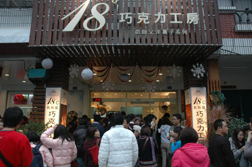 待擠到店前,號碼牌已抽到二百多號,因店內需保持低溫,確保巧克力品質, 一次只能進去六到八人,等候叫號時,騎樓下有咖啡和熱茶免費招待,且有服務人員端著巧克力讓人試吃。老闆在一旁另開的手工冰淇淋店,也是大排長龍。我看來客大都是年輕人,即有長者也是兒孫陪同。