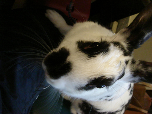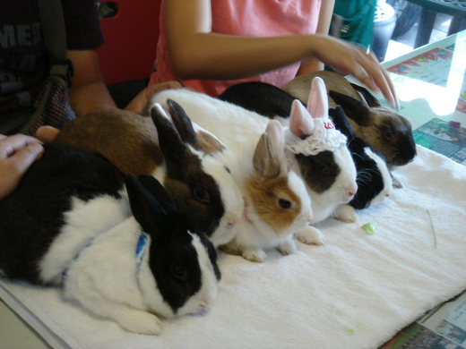 我在那邊話不多,但我家的兔兔在大型聚會當中陷入緊張,牠很少參加聚會或很少出去走走之類的,所以牠的心跳自然的跳得很快。而且當中有位糖糖爸和糖糖媽有抱著我家的兔兔,兔兔被抱的樣子很可愛,再加上還很乖呢!並且我抱著兔兔的時候還想要掙扎呢!不像糖糖爸、媽抱著牠這麼的乖巧,然怪我要向他們多多學習,他們都用嬰兒式抱法,可是我爸有說兔兔沒有抱習慣,都會想要掙扎、逃脫,但糖糖爸說是可能沒有抱到牠想要的姿勢才會亂動。只不過還有有位叫艾倫的人幫我家兔子畫自畫像呢!雖然畫起來讓我自認為不是很像,但很漂亮喔!