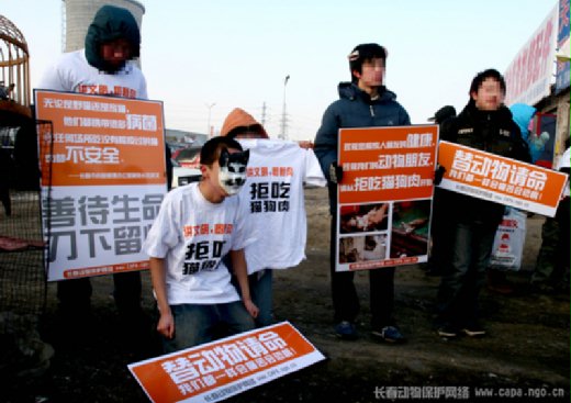2008年1月12日,吉林省长春市的动物保护人士来到长春市台北大街的鸽市(猫肉屠宰集中地),举行了一次“替动物请命——我们都一样会痛苦会恐惧!”的活动。
