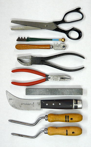 〈圖片:製作彩色玻璃(stained glass),必備的基本工具和顏料〉