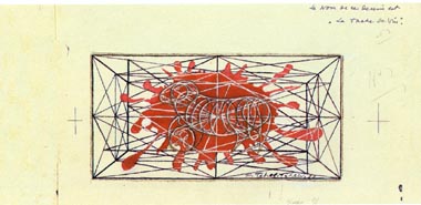 他為木桐設計的1956年酒標是《紅酒漬》的痕跡,在插畫中,以線圈組成的羊在紅酒中浸潤,象徵大自然產出豐盛的美酒和肉食物資。