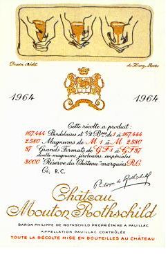 木桐酒莊1964年的酒標設計人是(Henry Moore亨利•摩爾1898年7月30日 - 1986年8月31日)是英國著名的雕塑家。他為木桐所設計的1964年酒標中,三隻由手捧著的金色的高腳酒杯,喚起了某種古代盛典時的肅穆情緒。