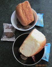 六歲半的貢丸早上起床說要在家吃早餐,於是就自己準備了兩份,一份給我,一份自己享用。麵包是阿公阿嬤昨天出去玩吃剩的,烤了一下,母子兩人在家享受了一頓悠閒的時光。吃著貢丸準備給媽媽的早餐,覺得好幸福啊!