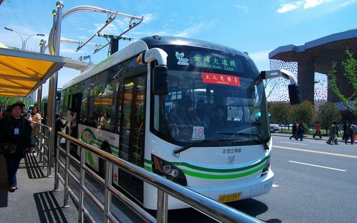 優遊於世博園區,靠的是來往於園區筆直街道上班次密集的公交車,至於閣下的「兩條腿」是留給排隊用的!而公交車的內裝無奇,與台北的低底盤公車(non step bus)相仿,然在靠站時卻意外的發現前車升起集電弓(Pantograph)(如附圖),此一在國內僅見於台鐵或高鐵動力車廂車頂的受電裝置,何以裝置於世博園區的公交車?且園區道路亦不見一般電車所需之架空電車線?待下車後定睛一看,才發現其電車線裝置於候車站外(如附圖),當公交車靠站上下客時,即升起集電弓進行充電!