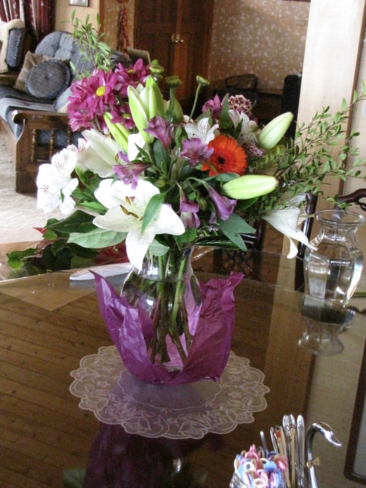 四月三十日,兒子從Slave Lake 回家,準備了歐洲地圖的GPS、歐規的充電器、轉換插座給我們,把要去的幾個國家的Hotel都輸入進去。當兒子在說明的時候,老爸聽的好專心,頻頻微笑、點頭。中午時間,馨兒跟她的男朋友David遠從沙烏地阿拉伯訂了一束香檳色的玫瑰跟百合送到家裡,祝我生日快樂及母親節快樂。