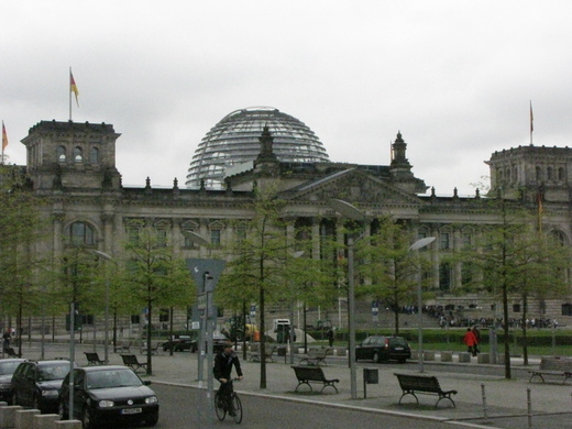 途經國會大廈,導遊先生說:「1933年2月27日國會引發大火,使國會遭到嚴重的損害,當時為了捕捉縱火犯,希特勒成立了納粹組織。二次大戦,炮火也是繞著國會大廈攻擊,德國統一後,決定修復國會大廈,1999年重新使用。頂樓採用大量的玻璃和輕鋼架,樓梯沿著圓頂邊緣螺旋而上,登頂後可以鳥瞰整個柏林市區。介紹的這麼好,可惜沒有帶我們進去參觀。遊覽車停在Brandenburg Gate旁邊半小時,建議我們可以照相留念。城門上勝利女神駕著四匹駿馬的戰車,這是東西德統一的象徵,也是唯一保留的十七世紀的城門建築。(1987年雷根總統就是在這裡演講,要求戈巴契夫總理開放東柏林),是德國最重要的地標。老公走路還是不太方便,所以我們沒有趕著過街跟城門合照。