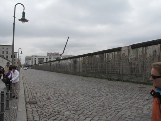 原要帶我們參觀Charlottenburg Palace,改到柏林圍牆。這圍牆是東德為避免人民投向西德,延著邊界築起的圍牆。圍牆將西柏林整個包圍起來,根據記載這圍牆是1961年開始建造,到1989年柏林圍牆倒塌事件才被群眾拆除,這些年間有很多的東柏林人想利用游泳、挖地道的方式越過這道圍牆。當宣布柏林圍牆即將開放,成群的柏林人爬上圍牆,走上街頭,將圍牆材料拿回家作紀念。我們站在柏林圍牆邊上,看到圍牆上圓形的覆蓋,那是防止逃亡者順利攀爬的設計。但是覺得圍牆並不高,也不厚,這使我心裡越發覺得可怕。你想,如果很高、很厚,想逃的人就少了,可是連我都覺得不是很高、很厚,在鐵幕裡生活的東柏林人,一定會想試試看。那無情的子彈,不知射殺了多少思鄉和愛自由的人。