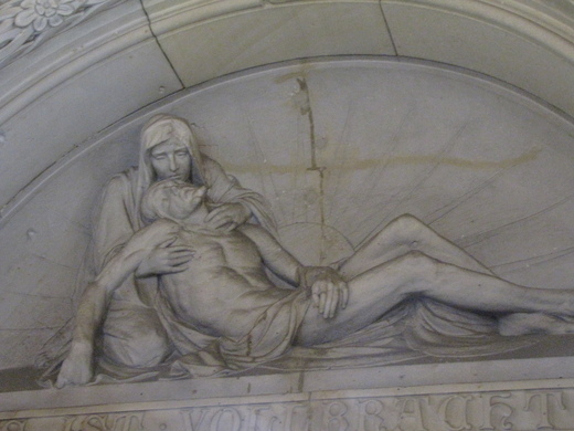 當遊覽車經過Tiergarten Park ,210呎高的自由紀念柱正在整修,仍可看到鍍金剝落的天使,以及紀念柱旁的精美繪畫。接著來到Kaiser Wilhelm Memorial Church。這是十九世紀為了紀念威廉一世統一德國而興建的,教堂天頂是很多小方塊的寶石玻璃拼鑲的圖案,牆邊有聖母的像,有浮雕(聖母面容淒苦心疼的抱著受難後的耶穌),象徵希望與和平的Stalingrad Madonna藝術品,還有一個耶穌受難的十字架,那天天氣陰冷,室內照相效果不好,很可惜!教堂在二次大戰中被毀,外觀仍保留被轟炸損壞時的模樣。牆上的青銅編鐘,完好的運轉著。步出教堂,手機鈴聲響起,原來是馨兒擔心爸爸腳疼,送了一段簡訊是萬一痛風厲害,如何用德文求醫。老爸回了電話,謝謝她的關心。