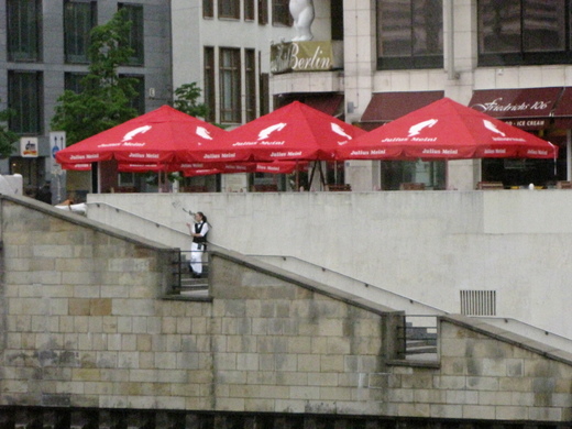 Potsdam有德國最古老的電影製片廠,也是一個大學城。宣哥拿著地圖說:「學生王子這部電影有一部份就是在這裡拍的。」公車經過,Filmmuseum很多人在這裡照像,Hollandsches Vertel一牌紅磚房的荷蘭區,那裡有一間書店、麵包店,和賣紀念品的商店。轉到Luisenplatz,這裡有一座1770年建造的Brandenburg Tor,Jagertor Charme Hotel 是Potsdam最好的五星級旅館,一路直行就到Schloss Sanssouci。這是Prussia國王Ferderick大帝的夏宮跟御花園。宮殿佔地500公頃,園內有Chinese Tea House,Neues Palais,Orangerie and Park Sanssouci。金碧輝煌的皇宮坐落在層層的葡萄籐的階梯之上,我們只繞著皇宮的噴泉、花園走一圈,就一個多小時。站在這裡,可以感受到一整隊的皇家御騎,帶領著Ferderick大帝亮閃閃的馬車,威風凜凜回家的氣勢。由皇宮側門到Orangerie and Park,過街就到Muhle了,這是1738年間就有的一座古老的風車,目前正在整修,街邊賣藝人在那兒吹著直笛。